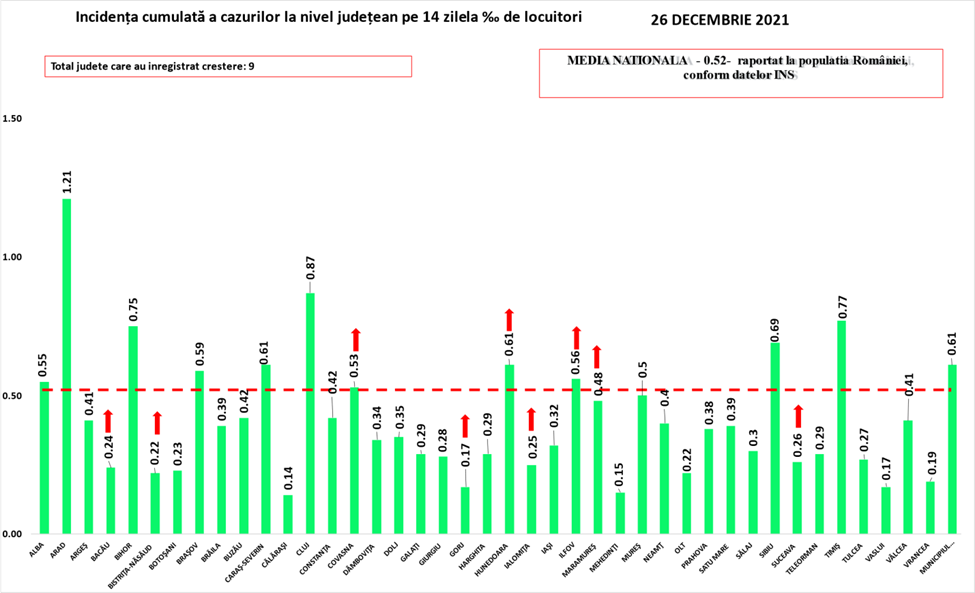 În intervalul 25.12.2021 (10:00) – 26.12.2021 (10:00) au fost raportate de către INSP 15 decese (5 bărbați și 10 femei), ale unor pacienți infectați cu noul coronavirus, internați în spitalele din Arad, Bacău, Caraș-Severin, Călărași, Gorj, Harghita, Mehedinți, Satu Mare, Sibiu, Vaslui și Vâlcea.