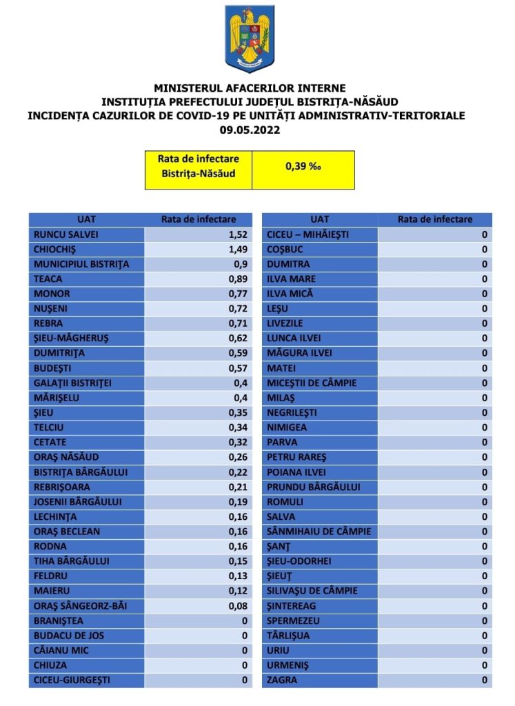 Ministerul Sănătății informează că numărul total al cazurilor de infectare cu virusul SARS-CoV-2 confirmate până astăzi în județul Bistrița-Năsăud este 29.997, cu 4 mai multe decât ieri.
