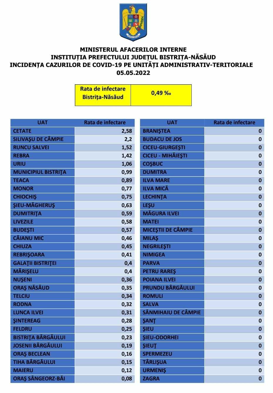 Ministerul Sănătății informează că numărul total al cazurilor de infectare cu virusul SARS-CoV-2 confirmate până astăzi în județul Bistrița-Năsăud este 29.997, cu 4 mai multe decât ieri.