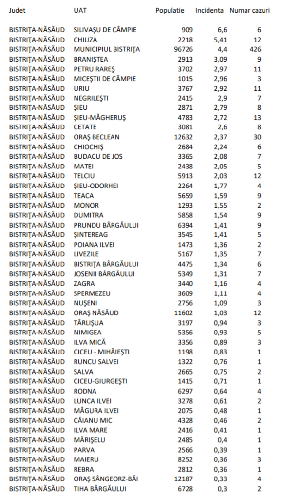Situația cu privire la rata de infectare din unitățile administrativ-teritoriale din județul Bistrița-Năsăud:
