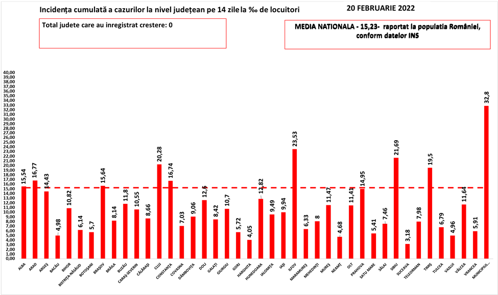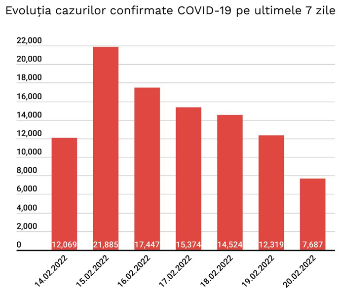 În intervalul 19.02.2022 (10:00) – 20.02.2022 (10:00) au fost raportate de către INSP 68 de decese (42 bărbați și 26 femei), dintre care 2 anterioare intervalului de referință, ale unor pacienți infectați cu noul coronavirus, internați în spitalele din Arad, Bacău, Bistrița-Năsăud, Botoșani, Brăila, Brașov, Călărași, Cluj, Constanța, Dolj, Gorj, Mehedinți, Neamț, Olt, Prahova, Satu Mare, Sibiu, Teleorman, Timiș, Vaslui, Vâlcea, Vrancea și Municipiul București.