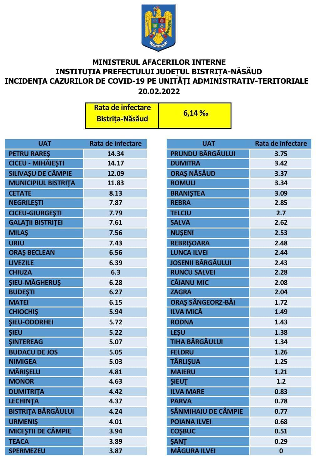 Situația cu privire la rata de infectare din unitățile administrativ-teritoriale din județul Bistrița-Năsăud: