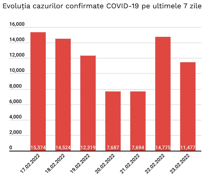 În ultimele 24 de ore au fost înregistrate 11.477 cazuri noi de persoane infectate cu SARS – CoV – 2 (COVID – 19), cu 3.298 mai puțin decât în ziua anterioară. 1.463 dintre cazurile noi din 24 de ore sunt ale unor pacienți reinfectați, testați pozitiv la o perioadă mai mare de 180 de zile după prima infectare.