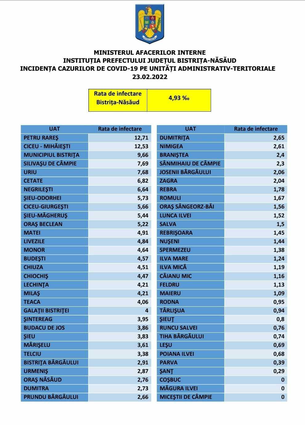 Situația cu privire la rata de infectare din unitățile administrativ-teritoriale din județul Bistrița-Năsăud: