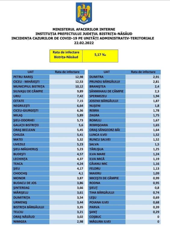 Situația cu privire la rata de infectare din unitățile administrativ-teritoriale din județul Bistrița-Năsăud: