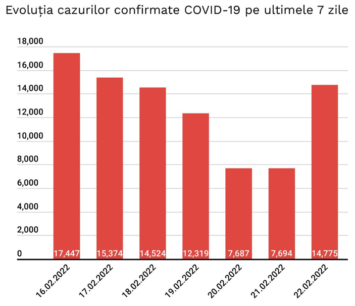 În ultimele 24 de ore au fost înregistrate 14.775 cazuri noi de persoane infectate cu SARS – CoV – 2 (COVID – 19), cu 7.081 mai mult decât în ziua anterioară. 1.860 dintre cazurile noi din 24 de ore sunt ale unor pacienți reinfectați, testați pozitiv la o perioadă mai mare de 180 de zile după prima infectare.