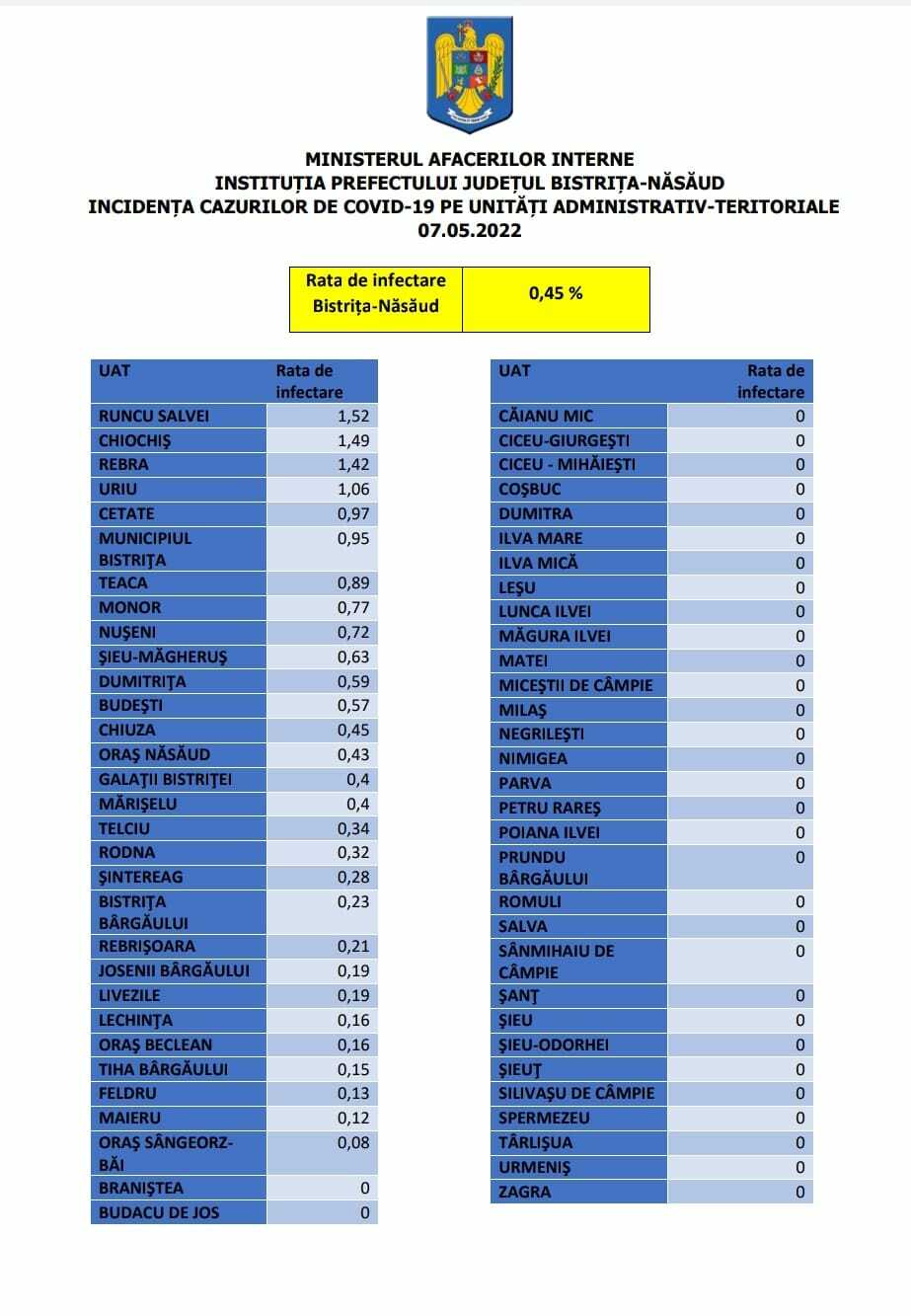 Situația cu privire la rata de infectare din fiecare oraș și comună din județ: