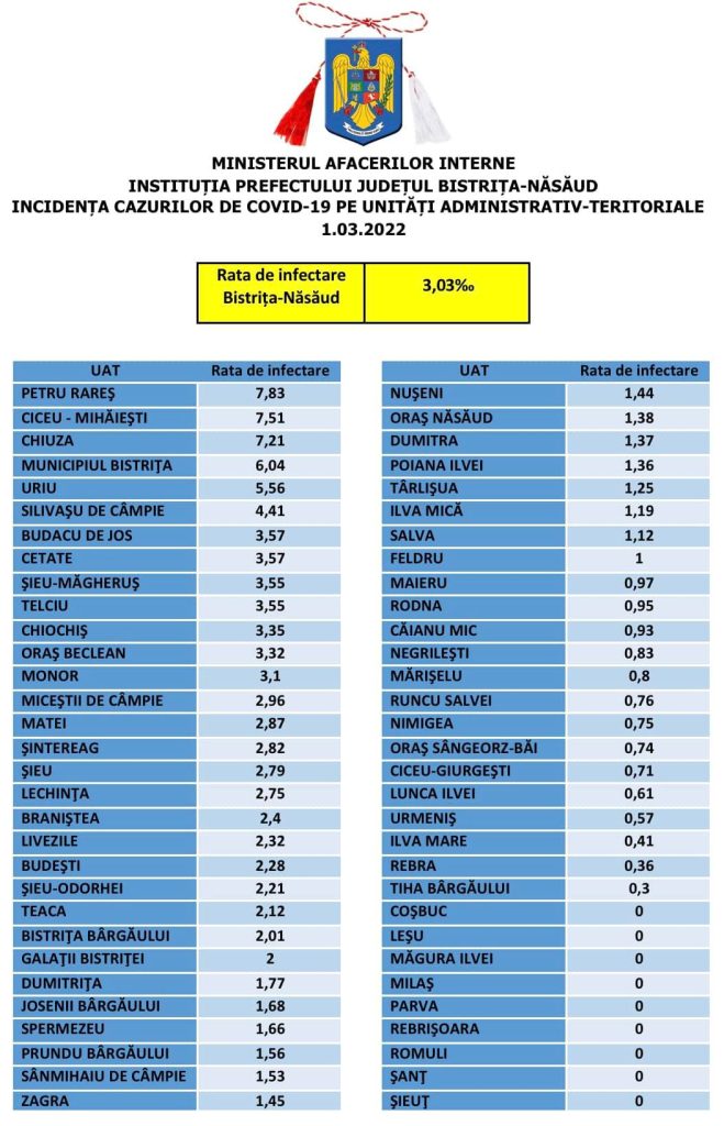 Situația cu privire la rata de infectare din unitățile administrativ-teritoriale din județul Bistrița-Năsăud: