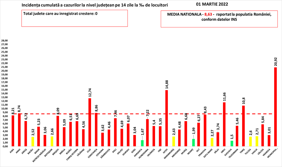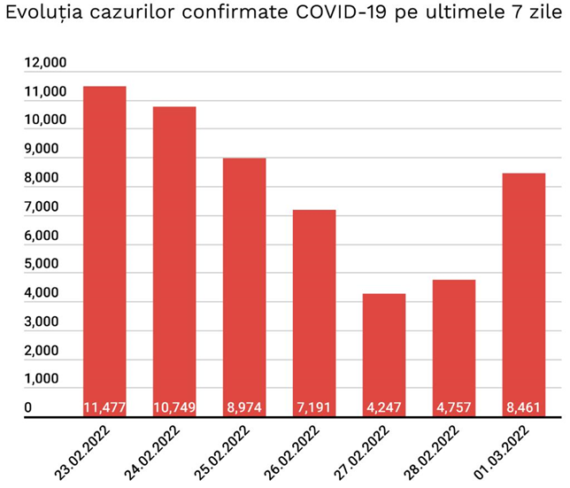 În intervalul 28.02.2022 (10:00) – 01.03.2022 (10:00) au fost raportate de către INSP 164 de decese (100 bărbați și 64 femei), dintre care 18 anterioare intervalului de referință, ale unor pacienți infectați cu noul coronavirus, internați în spitalele din Alba, Arad, Argeș, Bacău, Bihor, Bistrița-Năsăud, Botoșani, Brăila, Brașov, Buzău, Călărași, Caraș-Severin, Cluj, Constanța, Covasna, Dâmbovița,Dolj, Galați, Gorj, Harghita, Hunedoara, Iași, Ilfov, Mehedinți, Mureș, Neamț, Olt, Prahova, Sălaj, Sibiu, Suceava, Teleorman, Timiș, Vaslui, Vâlcea, Vrancea și Municipiul București.