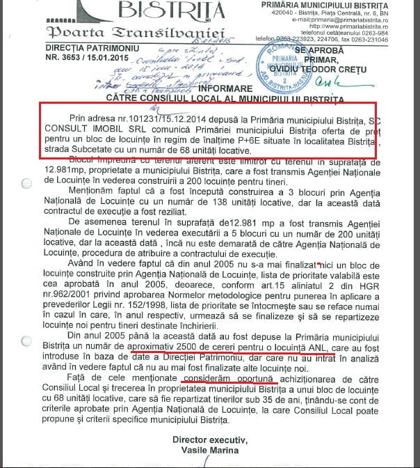 La un moment dat, Primăria Bistrița a primit o ofertă pentru cumpărarea unui bloc de pe piața liberă. Patronul Consult Imobil a înaintat o ofertă pentru achiziționarea unui bloc în care s-au construit 68 de apartamente. 2 MILIOANE de euro a fost suma solicitată, dar înțelegerea a căzut.