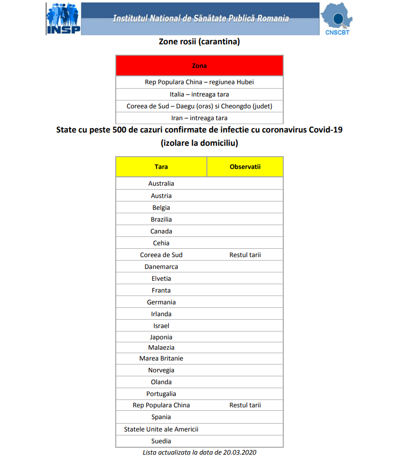 În ceea ce privește lista regiunilor și localităților din zona roșie și zona galbenă cu transmitere a COVID-19, aceasta a fost actualizată la data de 20 martie. Iată noua listă: