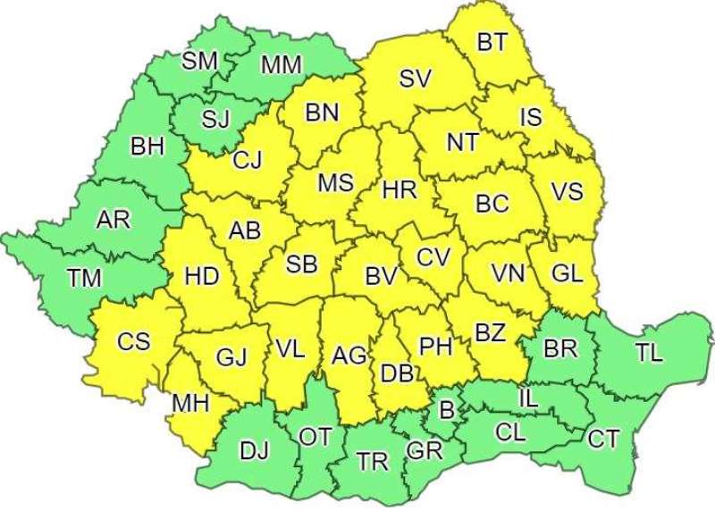 Administraţia Naţională de Meteorologie a emis marţi o altă atenţionare cod galben de instabilitate atmosferică temporar accentuată şi cantităţi de apă însemnate, valabilă de miercuri dimineaţa până joi dimineaţa în Transilvania, Moldova şi local în Banat, Oltenia, Muntenia şi la munte.