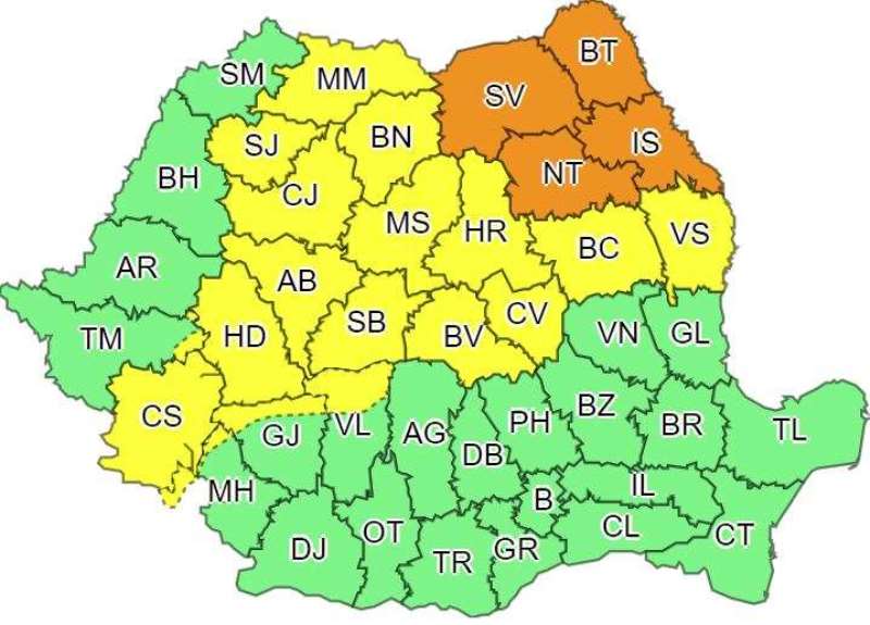 Pe de altă parte, în intervalul 24 august, ora 14:00 – 24 august, ora 22:00, județele Suceava, Botoşani, Neamţ şi Iaşi se află sub avertizare cod portocaliu de instabilitate atmosferică accentuată.