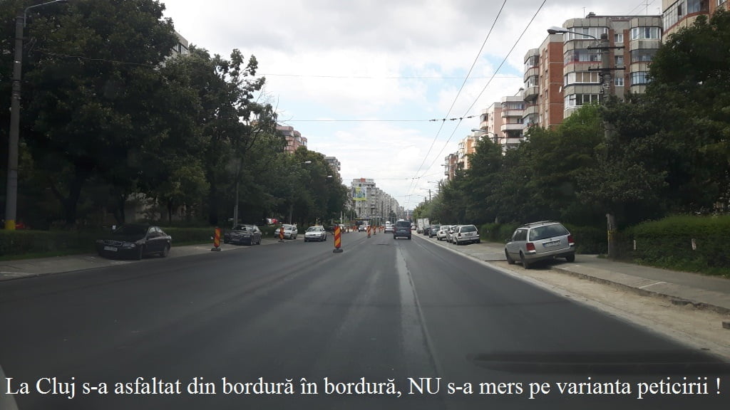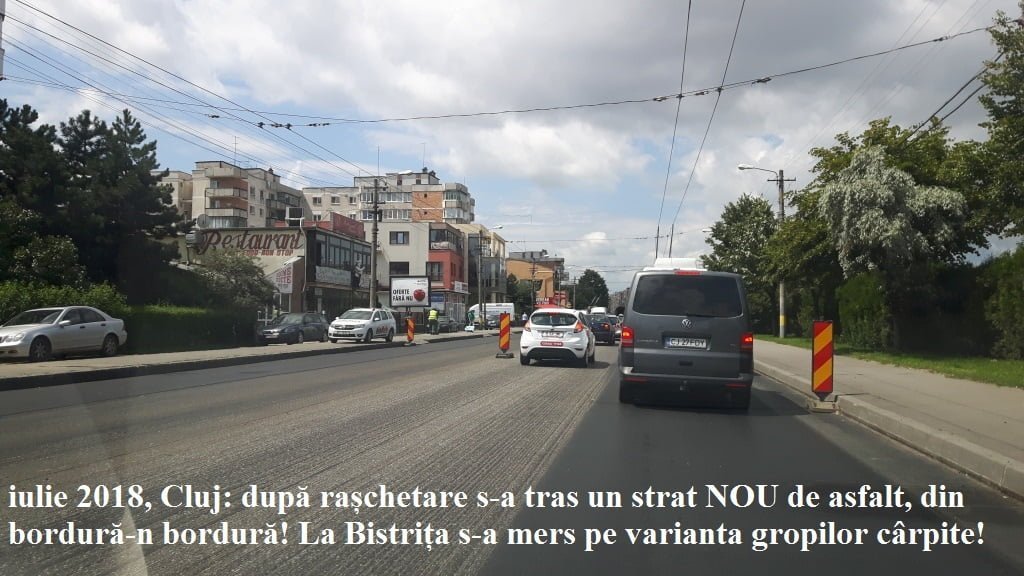 Ca și comparație, în municipiul Cluj, lucrările de modernizare a arterelor principale s-au realizat complet: asfaltul vechi a fost rașchetat, după cre a fost turnat un strat NOU de asfalt! Lucrările au decurs cu viteză și în maxim o săptămână de la rașchetare s-a turnat noul strat de asfalt.
