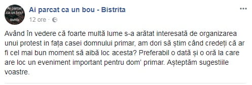 Răspunsurile la acest mesaj nu au întârziat să apară și există bistrițeni care s-au arătat interesați de o astfel de acțiune, motiv pentru care, pe aceeași pagină, se încearcă stabilirea unei date a posibilului protest.