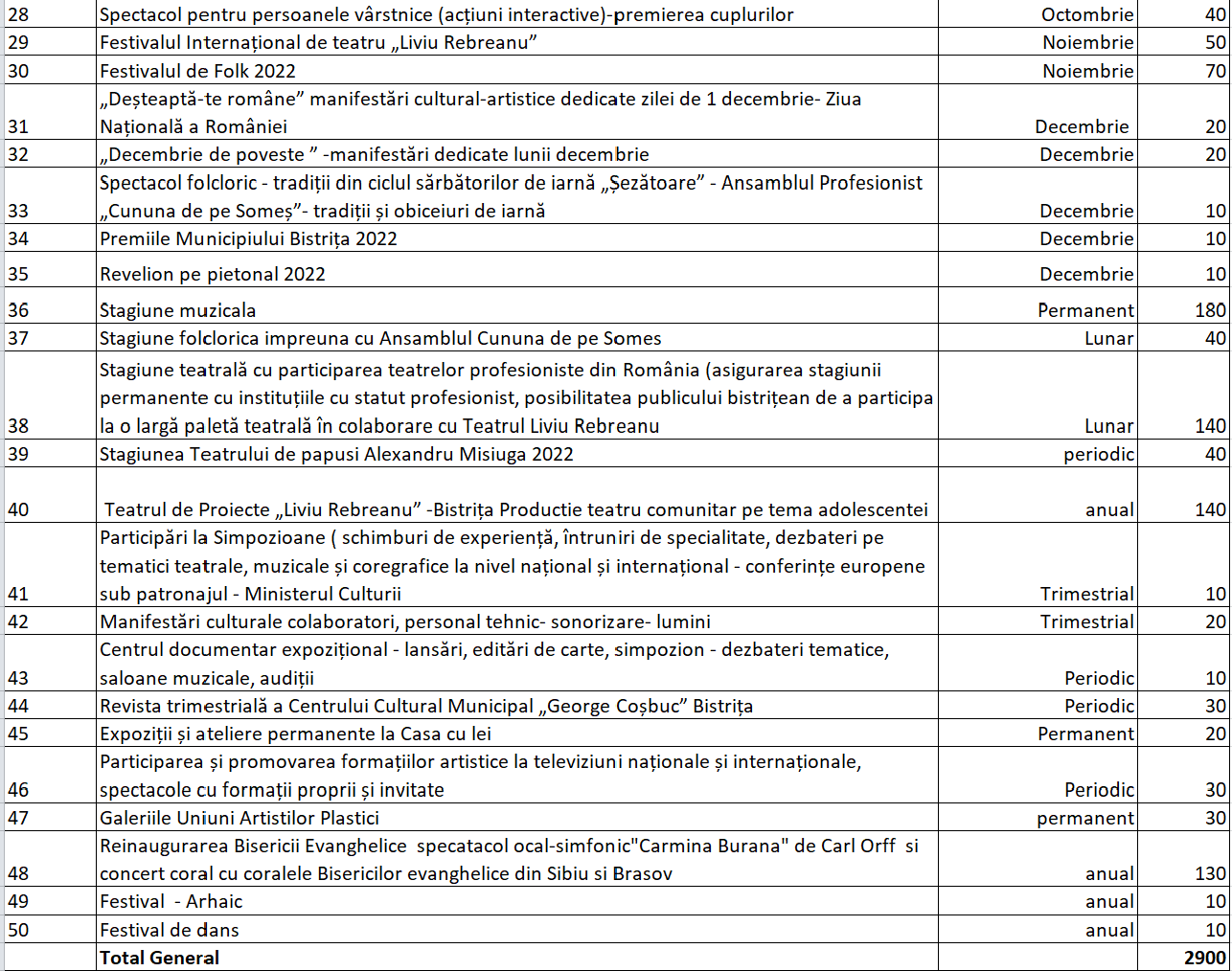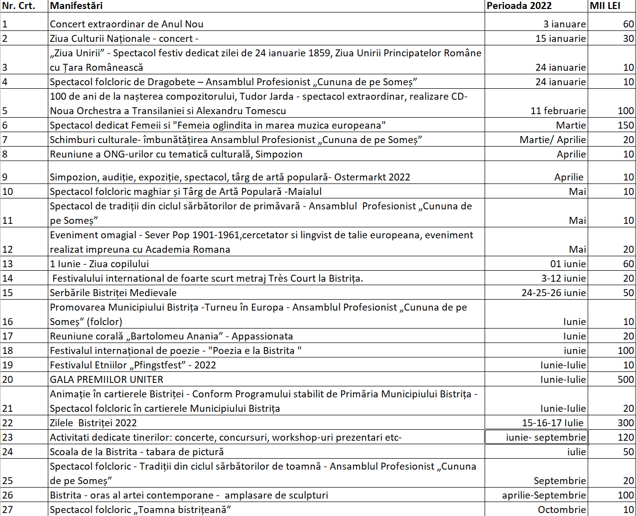 Lista completă a manifestărilor propuse de Centrul Cultural Municipal ”George Coșbuc” Bistrița pentru anul 2022 și suma necesară organizării acestor evenimente pot fi consultate mai jos: