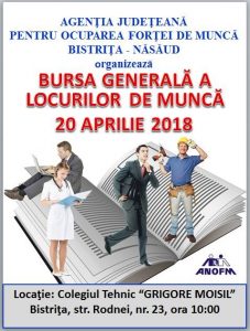 Agenţia Judeţeană pentru Ocuparea Forţei de Muncă Bistriţa – Năsăud va organiza în data de 20 aprilie, începând cu ora 10:00, Bursa Generală a Locurilor de Muncă.