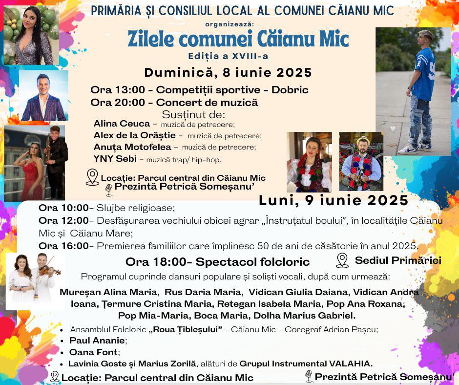 Manifestările încep duminică, 8 iunie, la ora 13:00, cu competiții sportive care vor avea loc la Dobric. Seara, începând cu ora 20:00, în Parcul Central din Căianu Mic, Alina Ceuca, Alex de la Orăștie, Anuța Motofelea și YNY Sebi (trap/hip-hop) vor susține momente artistice.