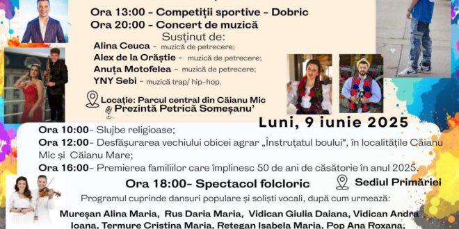 Manifestările încep duminică, 8 iunie, la ora 13:00, cu competiții sportive care vor avea loc la Dobric. Seara, începând cu ora 20:00, în Parcul Central din Căianu Mic, Alina Ceuca, Alex de la Orăștie, Anuța Motofelea și YNY Sebi (trap/hip-hop) vor susține momente artistice.