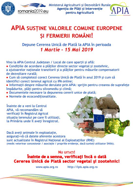 Agenția de Plăți și Intervenție pentru Agricultură Bistrița-Năsăud va da startul unei campanii de informare a fermierilor privind cererea unică de plată, aferentă anului 2019. Campania se va derula în toate localitățile din județ, sub sloganul “APIA susține valorile comunei europene și fermierii români!”.