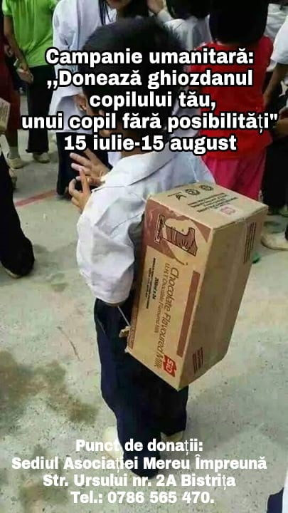 ”Dragi mămici și bunici, facem un apel la generozitatea și solidaritatea dumneavoastră și vă cerem ajutorul. Foarte mulți copilași din familii nevoiașe nu pot frecventa sau abandonează școala din cauza lipsurilor materiale. În cazul în care ghiozdanul copilului tău a rămas în stare bună, pune în el două caiete și două creioane. În cazul în care treningul pentru ora de sport i-a rămas mic, pune-l și ăla în ghiozdan și vino cu el la sediul Asociației Mereu Împreună” spun inițiatorii acestei campanii.