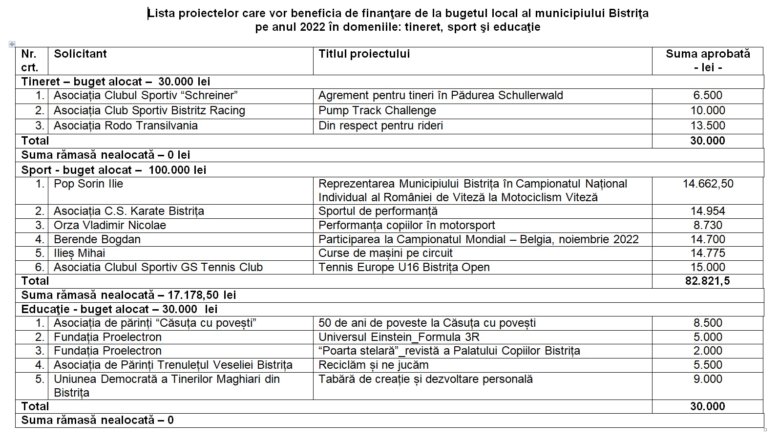 Astfel, proiectele selectate pentru a beneficia de finanţare de la bugetul județului Bistriţa-Năsăud pe anul 2022 sunt: