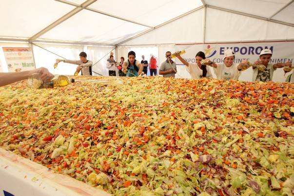 Recordul pentru cea mai mare salata, facuta din legume si verdeturi proaspete, a cantarit peste 19.050 kilograme si a fost realizata in data de 23 septembrie 2012 de catre Kaufland si Salve Club din Romania. Recordul a fost inregistrat la Centrul Expozitional Exporom Pantelimon din Bucuresti, Romania. Romania detine recordul privind cea mai mare salata vegetala din lume. Aceasta cantareste 19,05 tone si au muncit la ea cateva sute de voluntari din Bucuresti. Salata a fost preparata intr-un vas imens de 4.400 kg. Salata avea o inaltime de 53 de centimetri, 2,94 metri latime si 17,92 metri lungime. Pentru prepararea uriasei salate s-au taiat sase tone de rosii, patru tone de salata verde, patru tone de castraveti, doua tone de ardei, doua tone de ceapa si doua tone de morcovi. Pentru inmiresmarea ei s-au mai adaugat 400 de kilograme de masline, 800 de litri de ulei si 400 de kilograme de sare.
