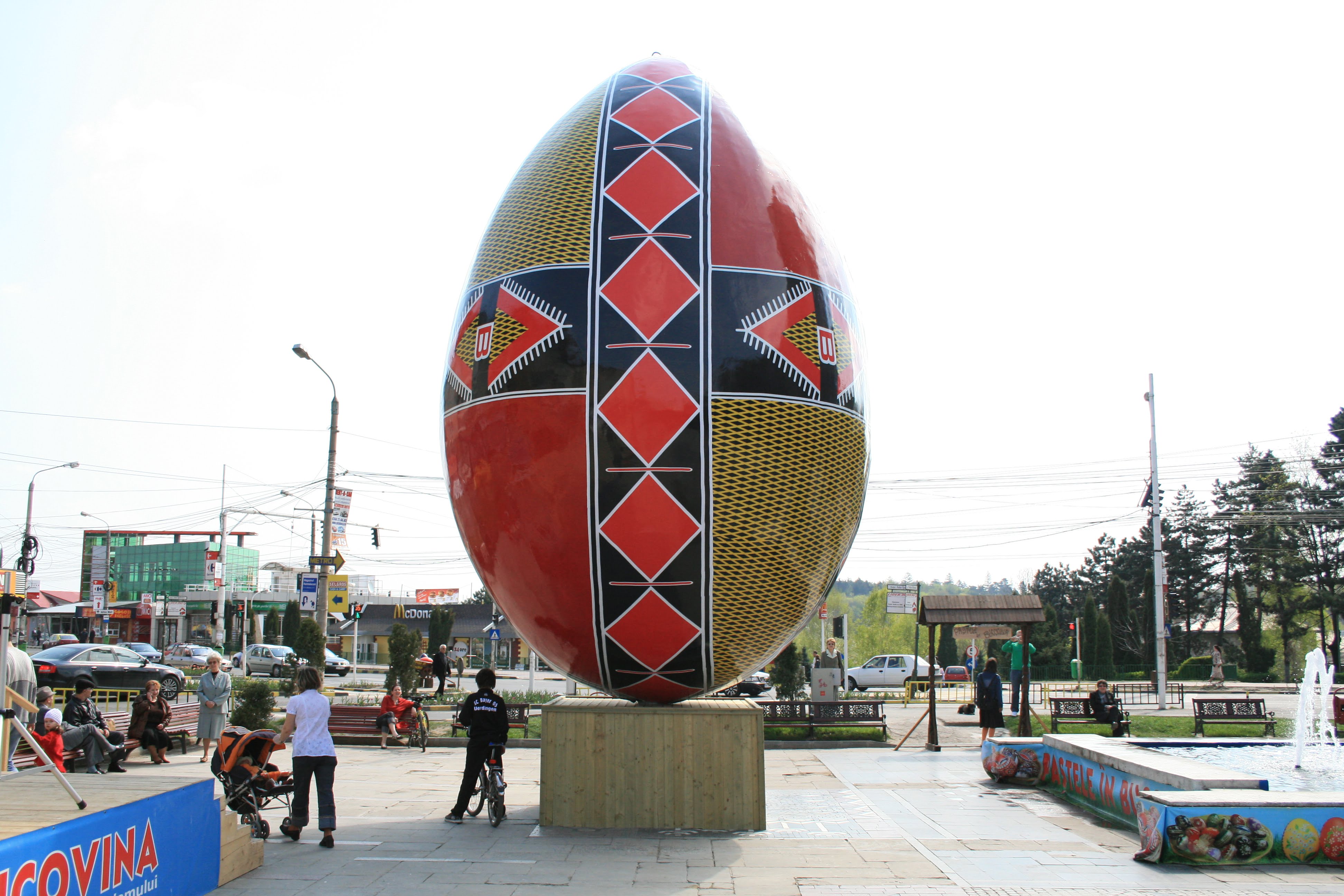 Localnicii din Suceava au intrat in Cartea Recordurilor cu cel mai mare ou incondeiat din lume. Oul urias a fost amplasat in centrul orasului Suceava si a fost omologat, la data de 18 aprilie 2009, de World Records Academy ca fiind cel mai mare ou traditional din lume. Acest ou a fost confectionat din fibra de sticla de catre o firma din Buzau si decorat cu desene realizate pe autocolant de catre o firma suceveana, are o inaltime de 7,25 metri, diametru de 4,6 metri si o greutate de 1,8 tone.