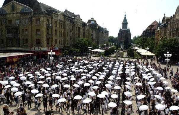 Recordul mondial privind cei mai multi dansatori in sincron cu umbrele a fost stabilit la Arenele Romane, Romania, unde Hewlett-Packard Global eBusiness Operations Centre a adunat 1.461 de oameni sub coordonarea unui coregraf profesionist care i-a coordonat pe toti cei 1.461 de participanti ce au dansat sincron cu umbrele colorate, timp de 6 minute si 24 de secunde. Acesta este un record indoor, deoarece la Timișoara au dansat cadril aproximativ 1.500 de elevi în cadrul unui eveniment intitulat Parada Absolvenţilor, organizată simultan în 60 de oraşe din 9 ţări. Dansul a durat 7 minute pe muzica lui Johann Strauss-fiul, cadrilul din opereta Liliacul. Dance with Europe se organiză anual și are sansa sa intre in Cartea Recordurilor dacă se adună peste 27.040 de participanti in toate orasele participante, acesta fiind ultimul record la categoria: „Cel mai sincronizat dans de pe planetă”