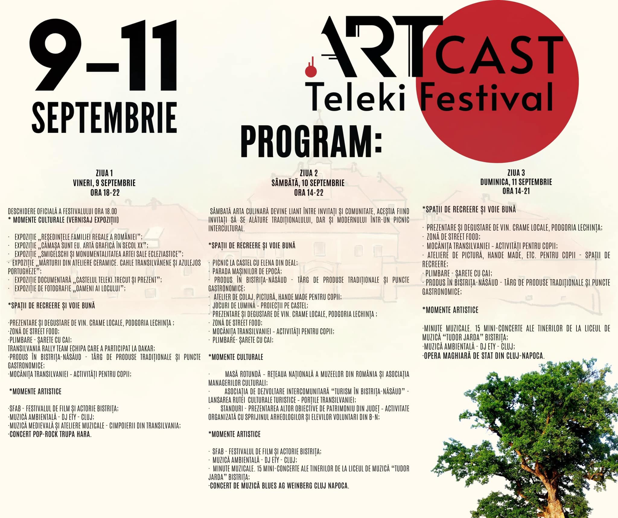 Deschiderea oficială a festivalului va avea loc vineri, 9 septembrie, de la ora 18:00, şi va fi marcată prin vernisarea a şase expoziţii. Programul va fi completat cu un festival de film, degustări de vinuri din zona viticolă Lechinţa, târg de produse tradiţionale, plimbări cu şareta trasă de cai şi momente muzicale susţinute de trupa Hara şi de Cimpoierii Transilvaniei.