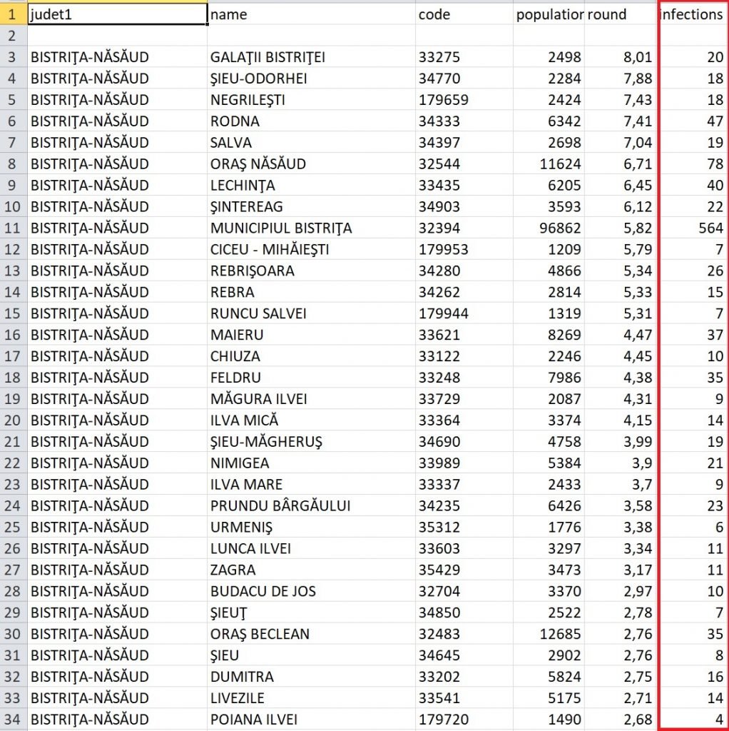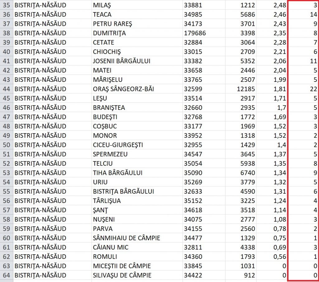 Totodată, incidență peste 6 la mia de locuitori au orașul Năsăud – 6,71 și comunele Lechința – 6,45 și Șintereag – 6,12.