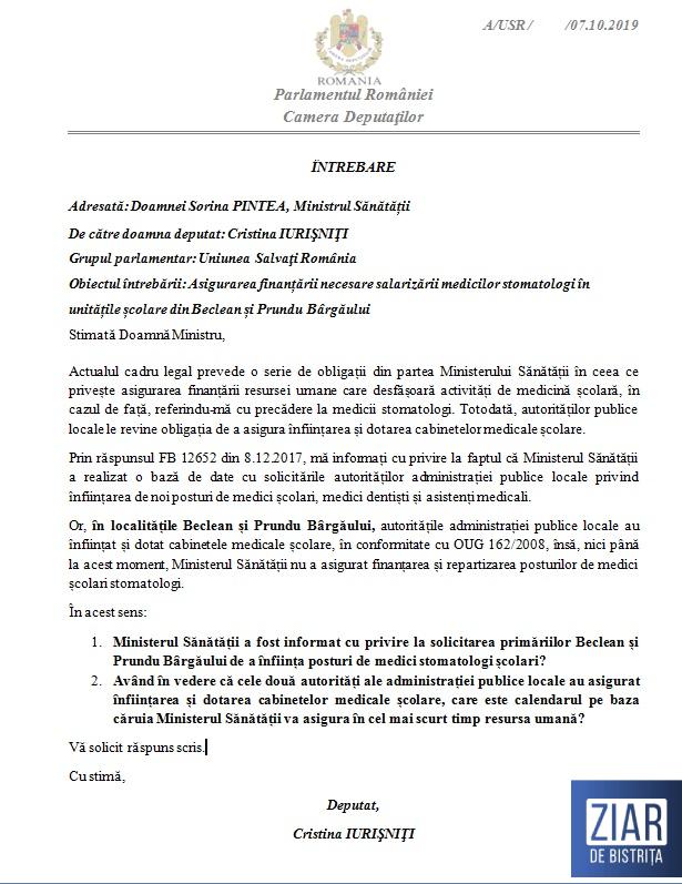 ”Autoritățile administrației localităților Beclean și Prundu Bârgăului m-au informat că au înființat și dotat cabinete medicale școlare în dorința de a le oferi elevilor cele mai bune servicii medicale. Din păcate, și la acest moment, cabinetele școlare stau închise pentru că Ministerul Sănătății nu a alocat finanțarea pentru salarizarea posturilor de medici stomatologi în aceste unități școlare”, spune deputatul Cristina Iurișniți.