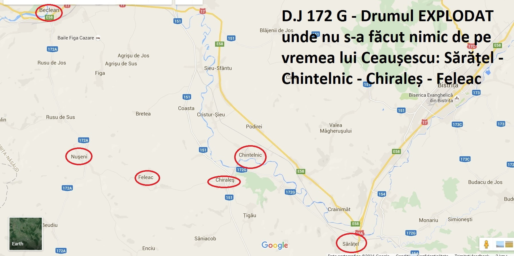 Drumul Județean 172 G e explodat și crează mari probleme șoferilor, pe tronsonul ce face legătura între 2 drumuri modernizate: D.N 15 A și D.J 151. Drumul explodat NU a fost modernizat în ulimii 25 de ani și este realizat de regimul comunist, din plăci de beton. Sectorul respectiv trece prin Sărățel – Arcalia – Chiraleş – Feleac și face joncțiunea cu D.J 172 A, drum care duce spre Beclean. Porțiunea Chiraleș – Feleac e cea mai afectată și locuitorii susțin că nici măcar o pietruire NU s-a realizat în acest an.