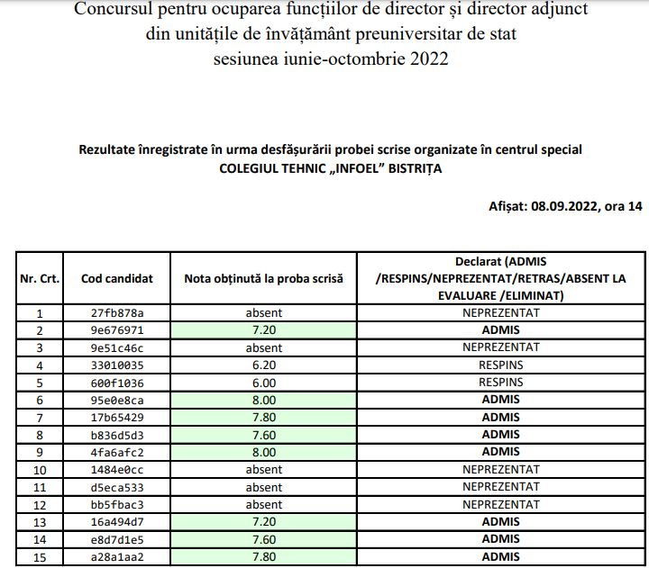Inspectoratul Școlar Județean Bistrița-Năsăud a publicat rezultatele obținute de candidații care au participat la probă scrisă a concursului pentru ocuparea unor posturi de directori şi directori adjuncţi în unitățile de învățământ din Bistrița-Năsăud.