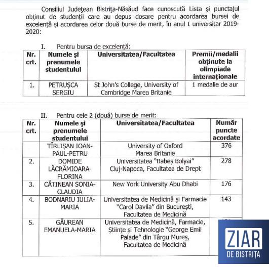 În ceea ce privește bursa de excelență, pentru aceasta a fost depus un singur dosar, al tânărului Sergiu Petrușca, absolvent al Colegiului Național ”Liviu Rebreanu” din Bistrița și student la St John’s College, University of Cambridge Marea Britanie.