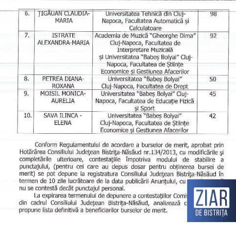 Punctajul a fost stabilit de o comisie special constituită în acest sens, care a întocmit și un clasament. Dacă nu vor fi depuse contestații, cei doi tineri – Paul Tîrlișan și Lăcrămioara Domide – au mari șanse să devină beneficiarii burselor de merit acordate de Consiliul Județean Bistrița-Năsăud.