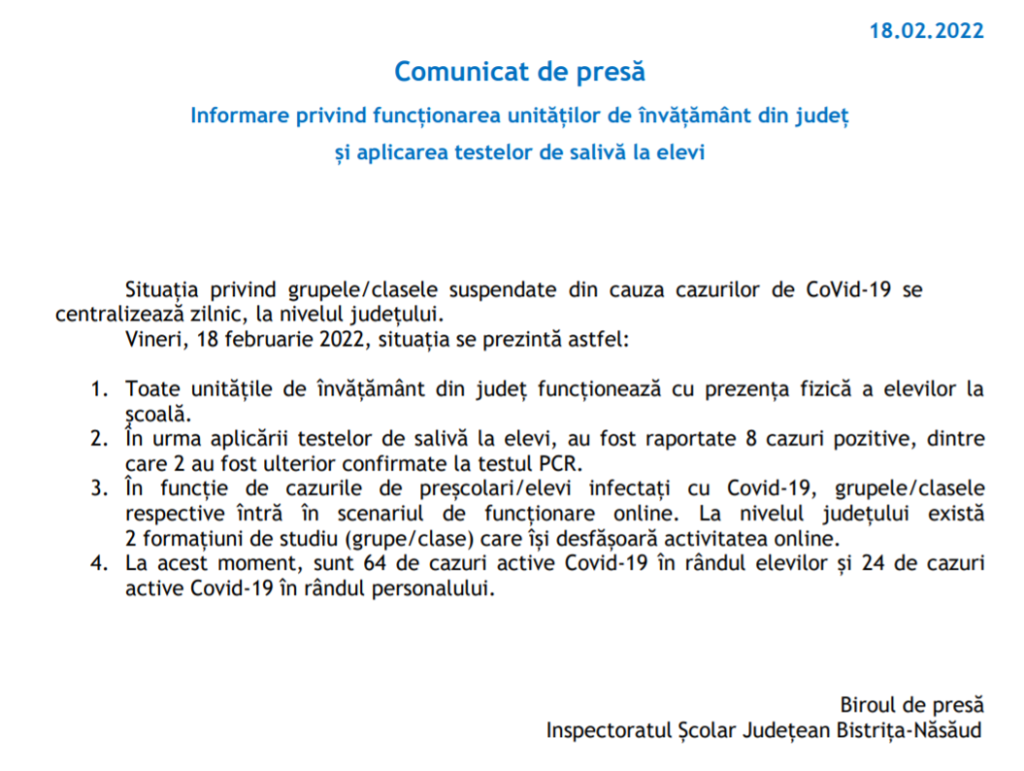 Totodată, IȘJ Bistrița-Năsăud precizează că 8 elevi din judeţ au avut rezultate pozitive la testele rapide de salivă efectuate acasă, două dintre rezultate fiind confirmate și de analizele de laborator, prin testare RT-PCR, în vreme ce restul au fost infirmate.