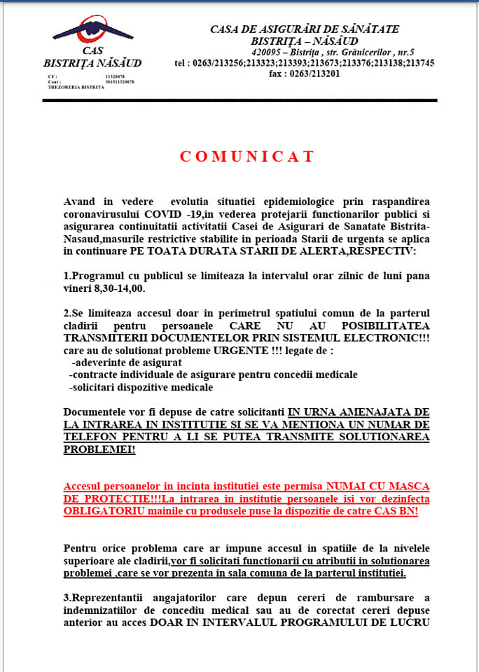 Deși joi este ultima zi de stare de urgență în România, unele instituții publice au anunțat că nu vor renunța la măsurile restrictive adoptate până acum, ba din contră, le vor menține și pe durata stării de alertă. O astfel de instituție este și Casa Județeană de Asigurări de Sănătate Bistrița-Năsăud.