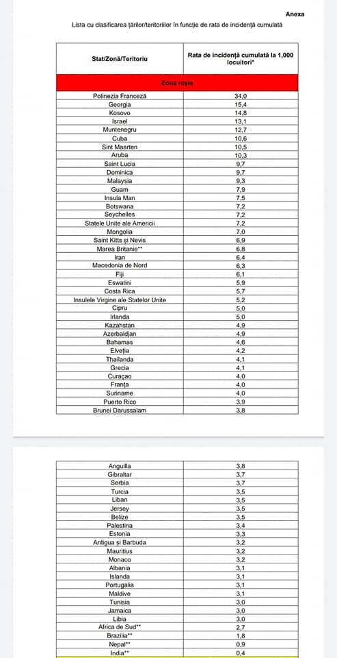Potrivit CNSU, în zona roşie au intrat Serbia, Estonia, Albania, Tunisia, Mauritius, Jamaica, Liban, Palestina, Belize, Antigua şi Barbuda, Suriname şi Brunei Darussalam.