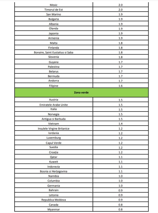 În zona galbenă au intrat, din zona verde, în urma creşterii incidenţei, Bulgaria, Serbia, Albania, Armenia, Slovenia, Belarus, Japonia, Palestina, Filipine, Mauritius, Timorul de Est, Brunei Darussalam, Guyana şi Bermuda.