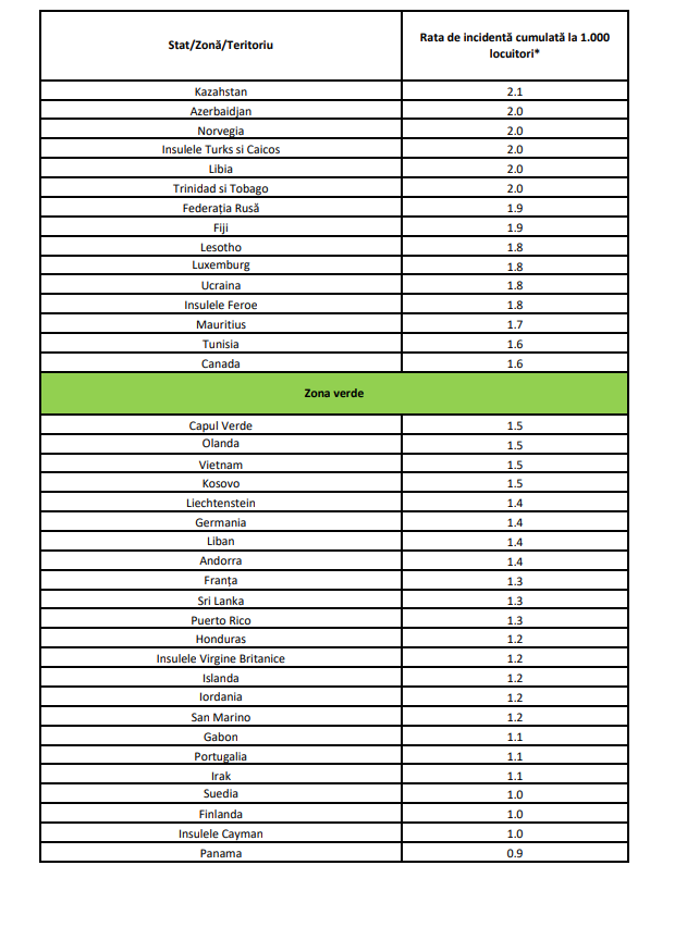 În zona verde au intrat Olanda, Germania, Franţa, San Marino, Liechtenstein, Vietnam, Puerto Rico, Sri Lanka, Honduras, Kosovo şi Capul Verde, potrivit hotărârii CNSU.