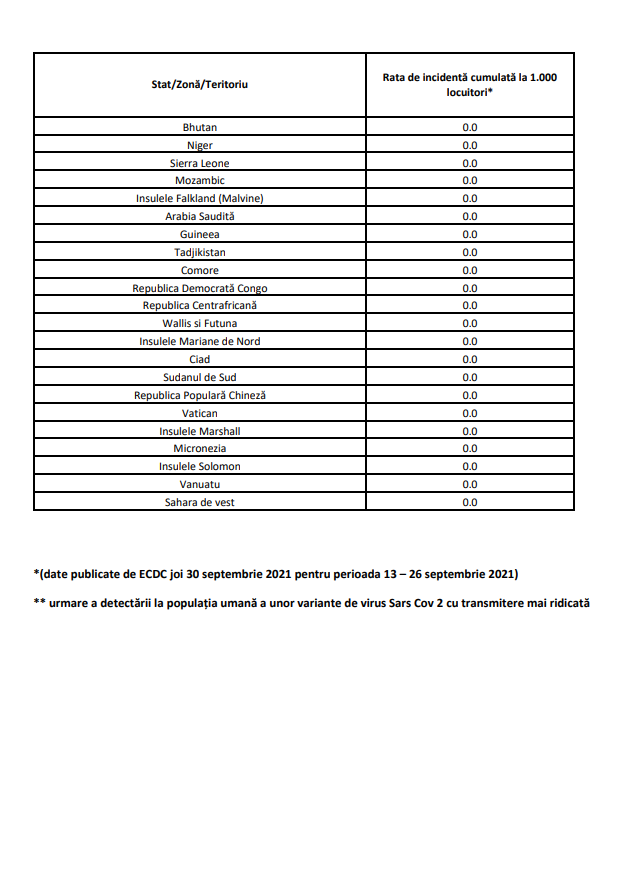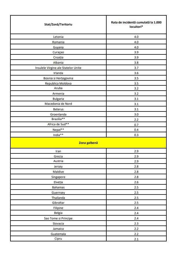 În zona galbenă au intrat: din zona roşie, în urma scăderii incidenţei, Austria, Elveţia, Gibraltar, Iran, Maldive şi Bahamas, iar din zona verde, în urma creşterii ratei, Ucraina, Insulele Feroe şi Leshoto.