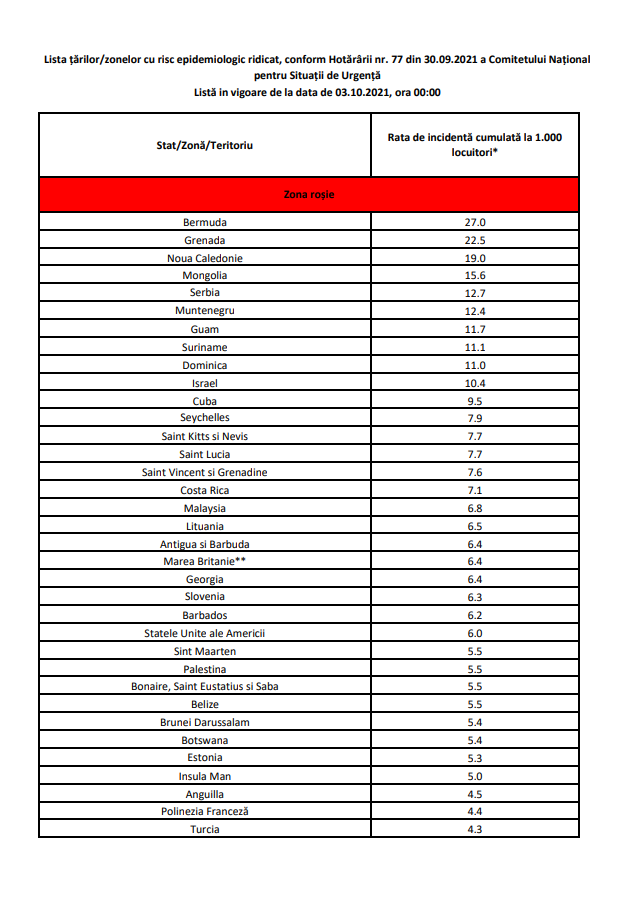 Potrivit hotărârii adoptate de CNSU, în zona roşie au intrat, ca urmare a incidenţei ridicate de îmbolnăviri cu SARS-CoV-2, România, Republica Moldova, Armenia, Bulgaria, Belarus şi Groenlanda.