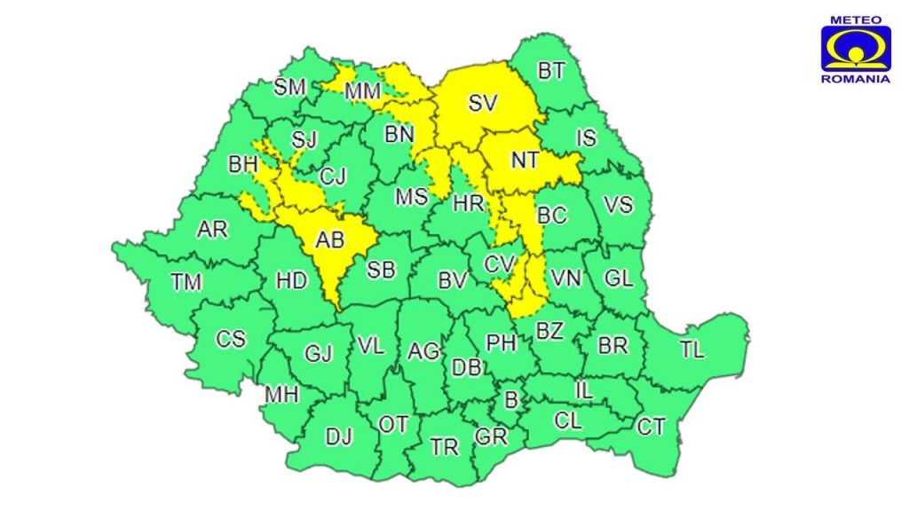 Judeţele vizate de atenţionarea cod galben sunt: Suceava, Neamţ, Alba, respectiv parţial Maramureş, Botoşani, Mureş, Harghita, Covasna, Bacău, Vrancea, Buzău, Sălaj, Cluj şi Bihor.