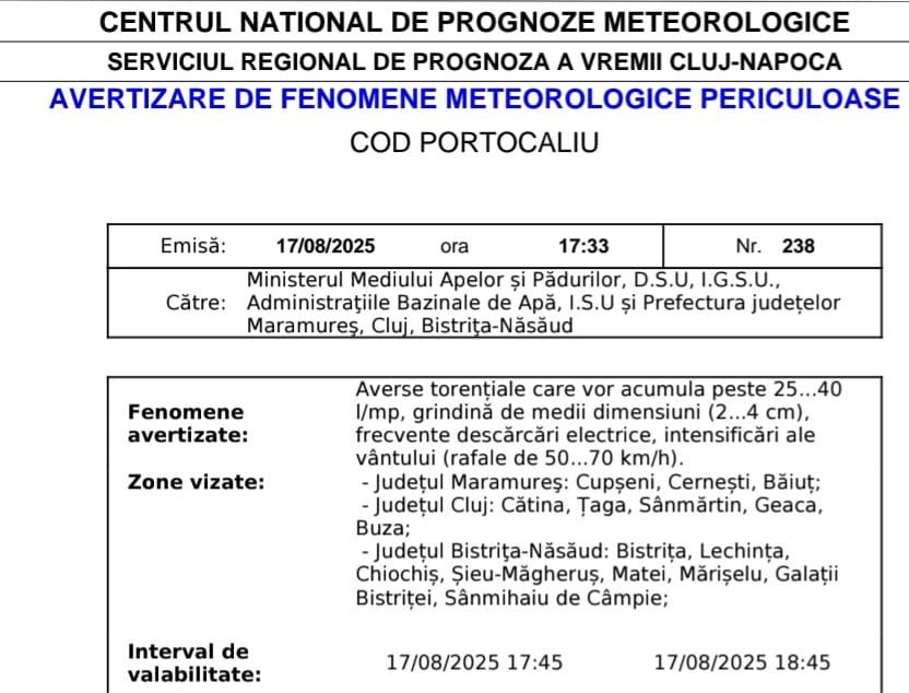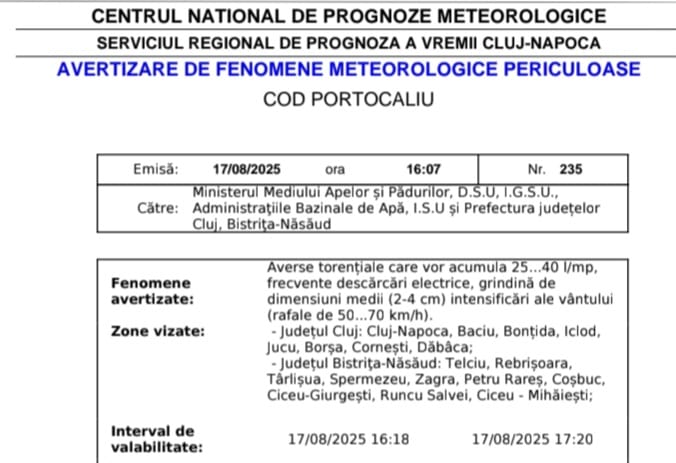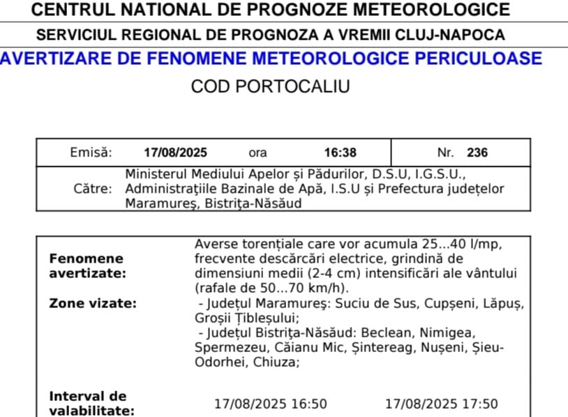 Inspectoratul pentru Situații de Urgență Bistrița-Năsăud a trimis mesaj prin sistemul Ro-Alert prin care avertizează populația din mai multe localități cu privire la posibilitatea apariției unor fenomene meteorologice periculoase.