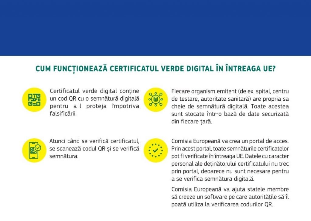 - Adeverințele vor include un set limitat de informații, cum ar fi numele, data nașterii, data eliberării, informații relevante cu privire la vaccin/test/vindecare și un identificator unic al adeverinței. Aceste date pot fi verificate numai pentru a confirma și a verifica autenticitatea și valabilitatea adeverințelor.