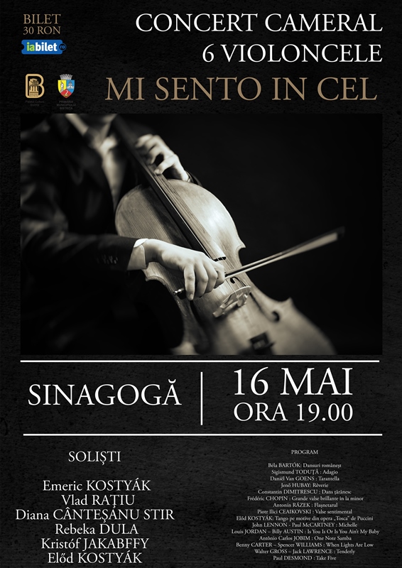 Centrul Cultural Municipal ”George Coşbuc” și Primăria Bistrița organizează un eveniment muzical deosebit: concertul cameral ”MI SENTO IN CEL”, susținut de sextetul de violoncele Cell’Opera. Evenimentul va avea loc vineri, 16 mai, la ora 19:00, la Sinagoga din Bistrița.