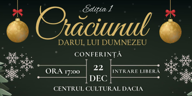 Centrul Cultural Dacia din municipiul Bistrița va găzdui duminică, 22 decembrie, conferința ”Crăciunul – Darul lui Dumnezeu“.