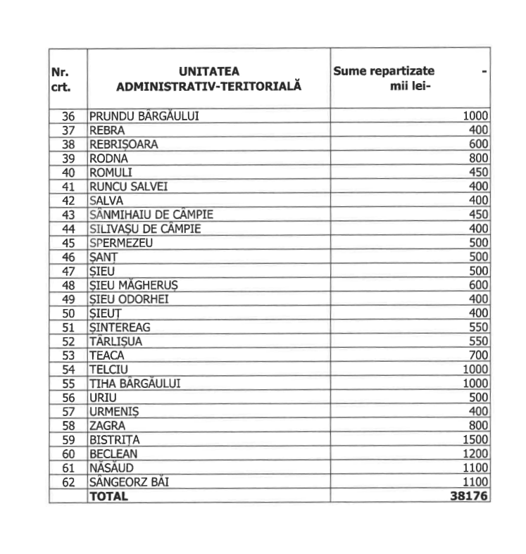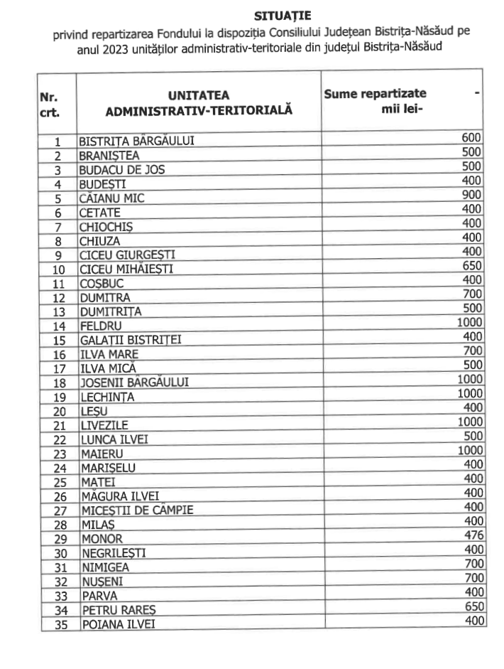 Potrivit proiectului aprobat de Consiliului Județean Bistrița-Năsăud, cele mai mari sume revin municipiului Bistrița – 1.500.000 lei, orașului Beclean – 1.200.000 lei și orașelor Năsăud și Sângeorz Băi – câte 1.100.000 lei fiecare. De asemenea, printre primăriile care primesc cei mai mulți bani se numără Tiha Bârgăului, Telciu, Maieru, Feldru, Josenii Bârgăului, Lechința, Livezile, Prundu Bârgăului – câte 1.000.000 lei fiecare.