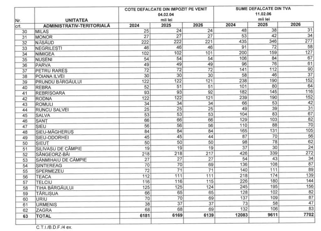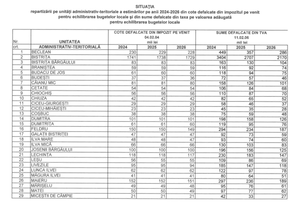 ”Prin Legea nr.368/19.12.2022 a fost aprobat bugetul de stat pe anul 2023, iar potrivit prevederilor acestui act normativ, în anul 2023, din impozitul pe venit estimat a fi încasat la bugetul de stat se constituie o cotă de 6% într-un cont distinct denumit fond la dispoziția Consiliului Județean, care se repartizează bugetelor locale ale comunelor, oraşelor şi municipiilor prin hotărâre a Consiliului Judeţean. Potrivit prevederilor Legii bugetului de stat pe anul 2023, sumele corespunzătoare cotei de 6% din impozitul pe venit se repartizează în mod egal județelor, în limita sumei de 38.176.000 lei și se repartizează integral în anul 2023 comunelor, oraşelor şi municipiilor, prin hotărâre a consiliului judeţean, pentru susţinerea programelor de dezvoltare locală, pentru susţinerea programelor de infrastructură care necesită cofinanţare locală, precum şi pentru cheltuielile de funcţionare, pe care unităţile administrativ-teritoriale din judeţ, în mod justificat, nu le pot finanţa din veniturile proprii, inclusiv din impozitul pe venit şi din sume defalcate din taxa pe valoarea adăugată pentru echilibrarea bugetelor locale”, se arată în proiectul de hotărâre care a fost adoptat joi de Consiliul Județean Bistrița-Năsăud.